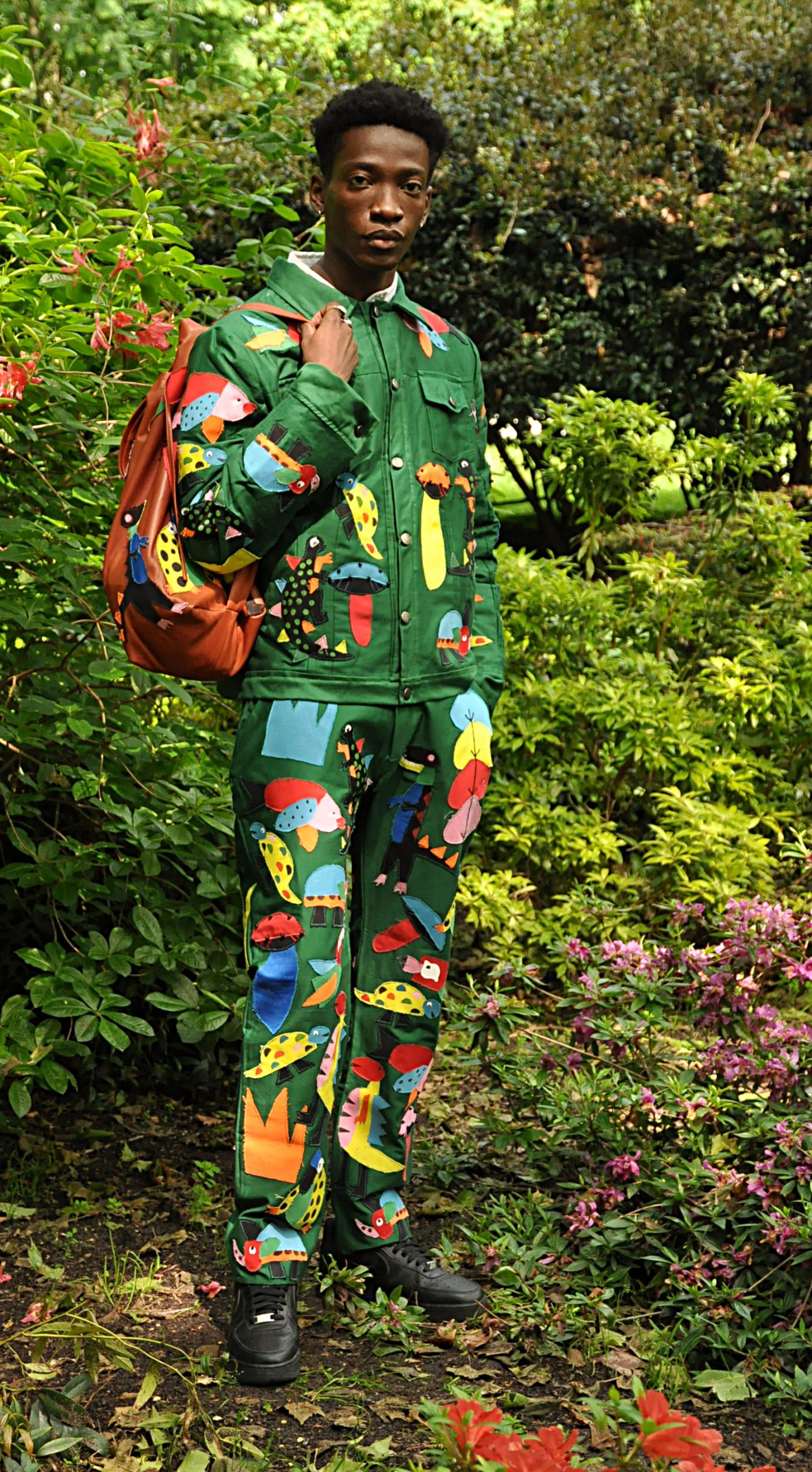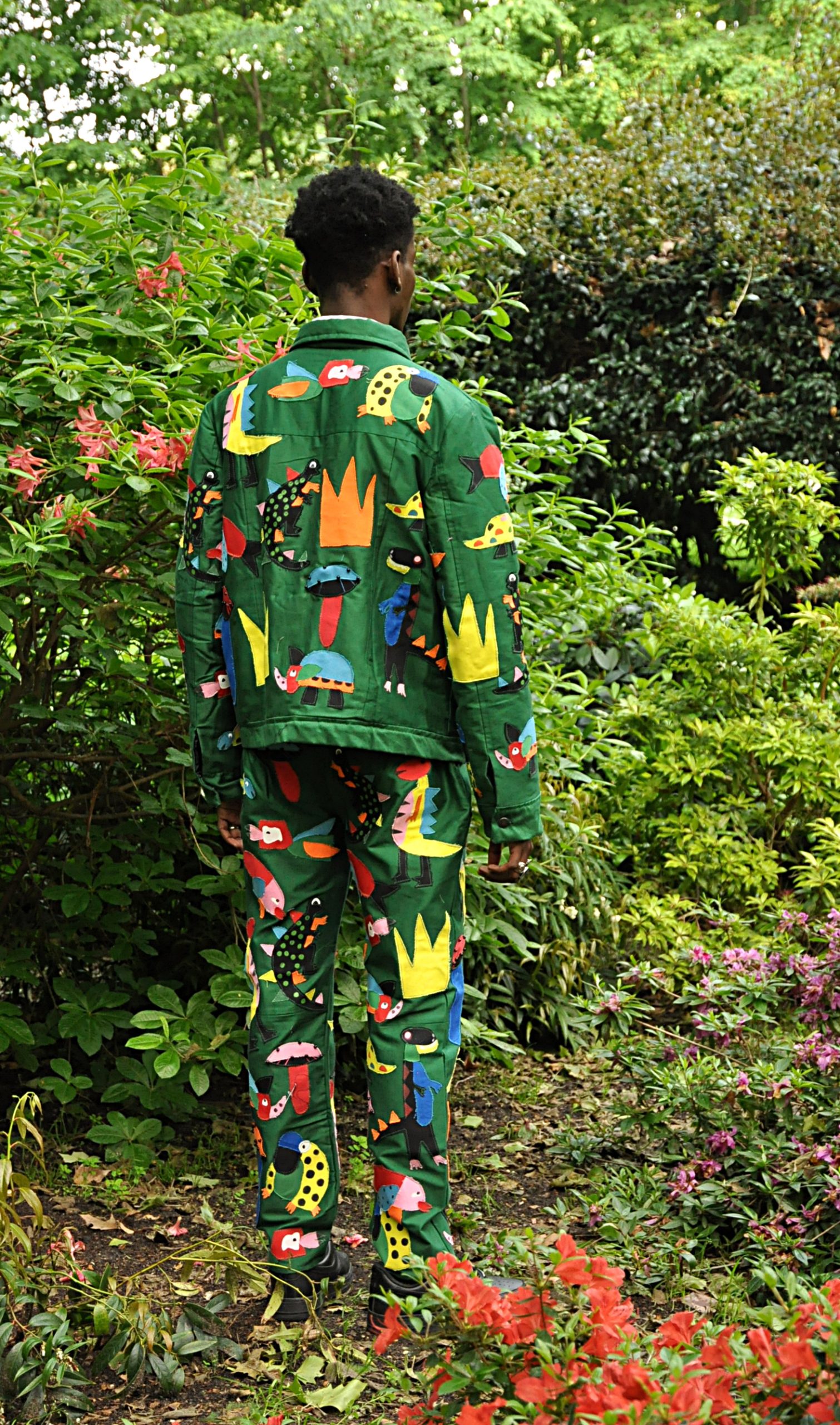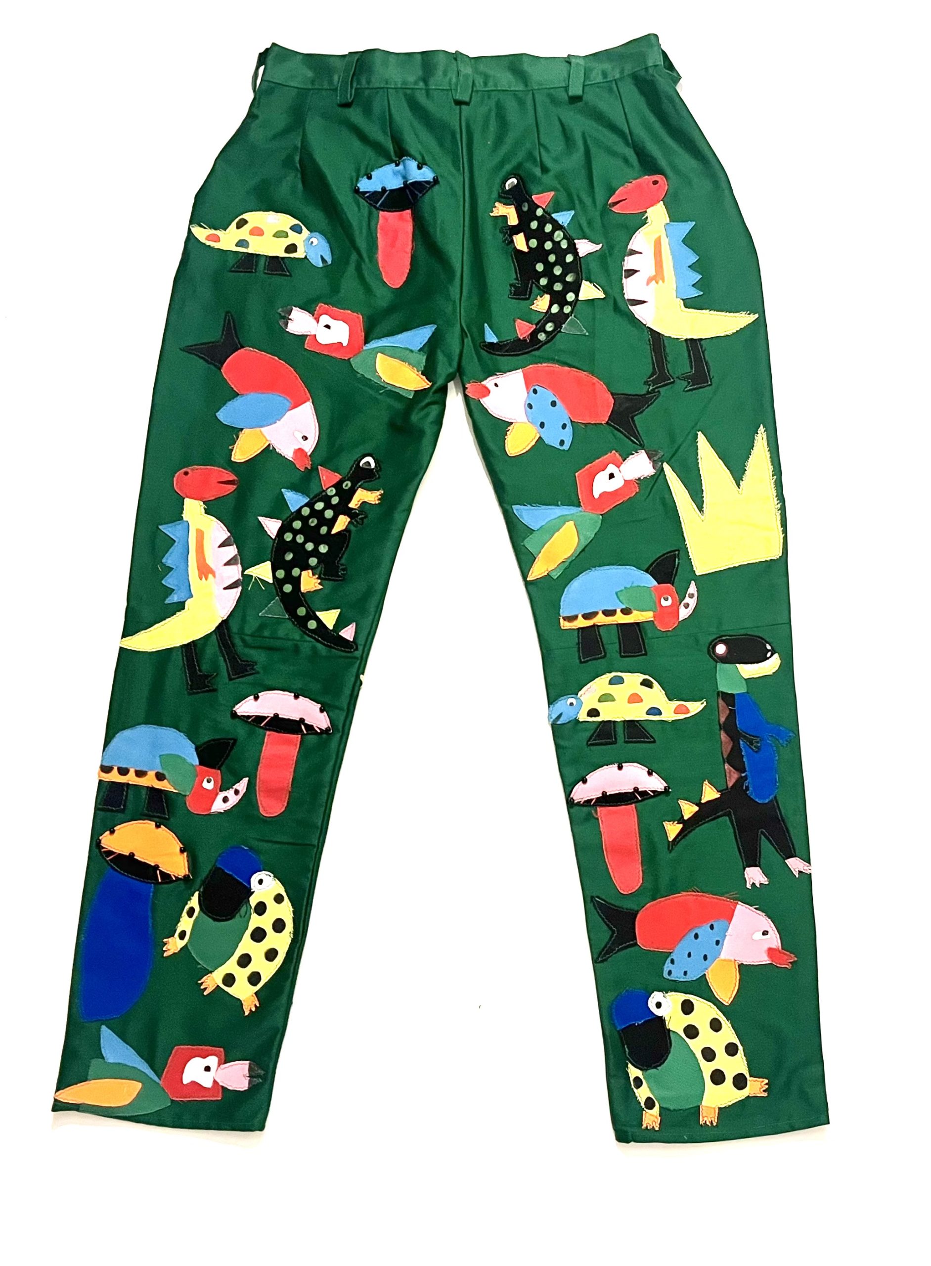Green straight fitted pants with all over 3D exotic animals and nature detailing appliqué.